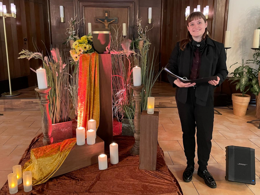 - Auf Wunsch Anleitung und Unterstützung von weltlichen Ritualen (wie z.B. gemeinschaftliches Kerzen entzünden, ökologisch unbedenkliche Grabbeigaben feierlich übergeben etc.)