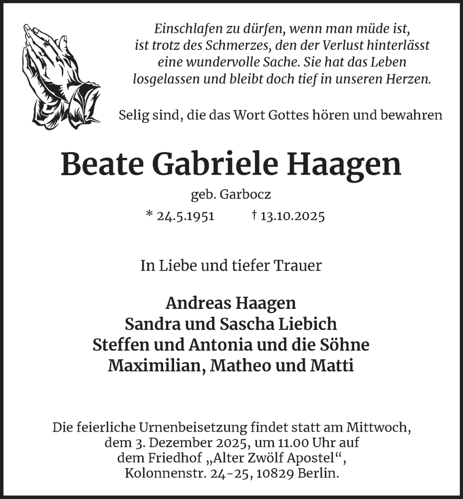 Hier finden Sie alle Traueranzeigen aus der Zeitung, die bisher für Beate Gabriele Haagen erschienen sind. Weitere Traueranzeigen, die in der Zeitung erscheinen, werden hier ebenfalls aufgelistet