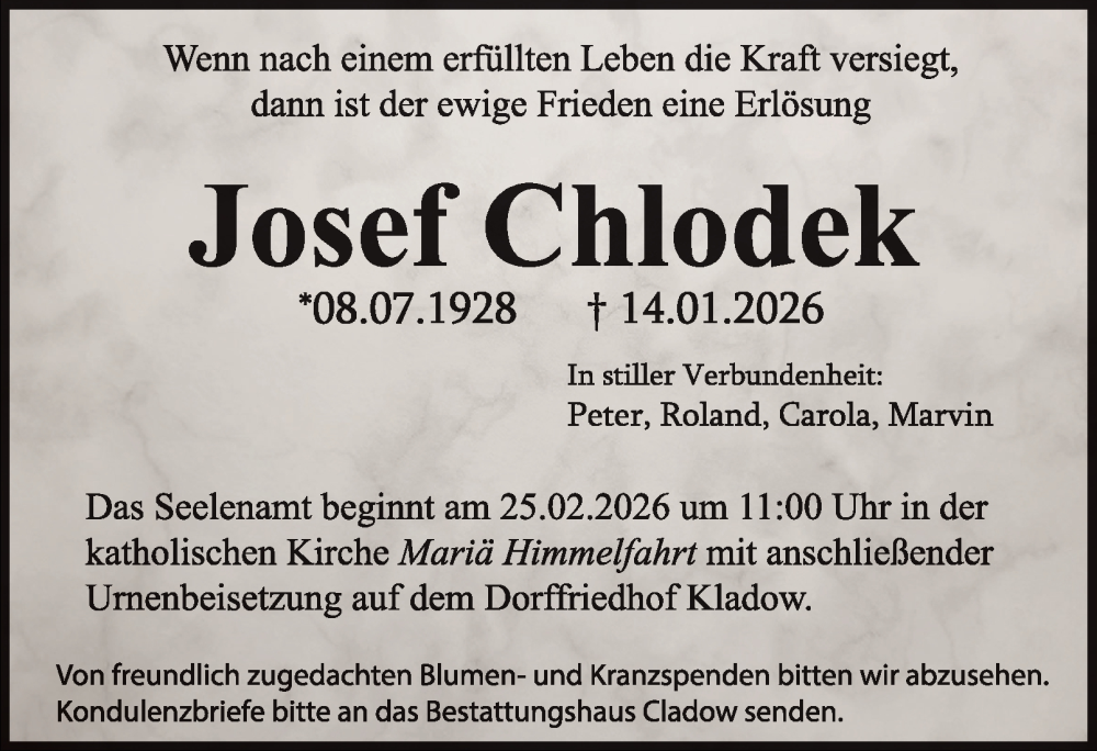 Hier finden Sie alle Traueranzeigen aus der Zeitung, die bisher für Josef Chlodek erschienen sind. Weitere Traueranzeigen, die in der Zeitung erscheinen, werden hier ebenfalls aufgelistet