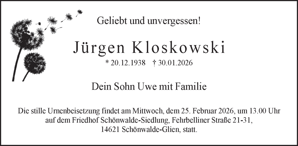 Hier finden Sie alle Traueranzeigen aus der Zeitung, die bisher für Jürgen Kloskowski erschienen sind. Weitere Traueranzeigen, die in der Zeitung erscheinen, werden hier ebenfalls aufgelistet