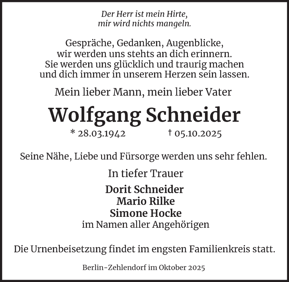 Hier finden Sie alle Traueranzeigen aus der Zeitung, die bisher für Wolfgang Schneider erschienen sind. Weitere Traueranzeigen, die in der Zeitung erscheinen, werden hier ebenfalls aufgelistet
